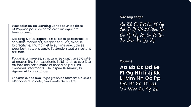 Chaque élément a été pensé pour mettre en valeur son style : des couleurs harmonieuses et des typographies marquantes, tout est conçu pour séduire les clients. L’objectif ? Faire ressentir son univers dès le premier regard, que ce soit sur écran ou sur papier.