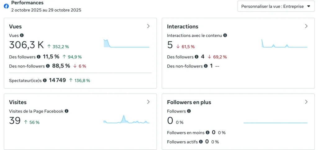 Cette capture d’écran montre les statistiques d’une des pages Facebook que je gère, via la Meta Business Suite.