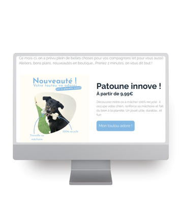 Là encore, j’ai tenu à maintenir la présence de Patoune en dehors du local de l’entreprise, notamment à travers une newsletter mensuelle, un site internet et une présence quotidienne sur les réseaux sociaux. Le tout, toujours en accord avec nos cibles : des personnes ayant des animaux, particulièrement des chiens, chats ou hamster, et susceptibles d’être concerné par l’achat de jeux et nourriture pour animaux dans une démarche éthique et en faveur de l’environnement. Une présence multicanal essentielle, qui nous permet d’accroître notre visibilité tout en fidélisant continuellement nos clients et prospects !